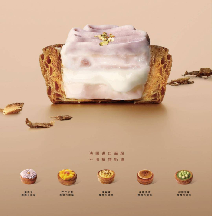 加速跑出新赛道的还有一贯爱出新的喜茶,这次把奶茶玩了个“变形计”,前几日竟上新“糯糯可颂挞”系列,口味包括“爆芋泥”“芒芒甘露”“黑糖波波”“绿妍苦抹”“爆榴莲”等等,有网友在社交平台上表示,这是要做“固体奶茶”吗?研发人员说,“糯糯可颂挞”风味灵感确实源自喜茶经典茶饮,目前由深圳欢乐海岸Lab店现烤制作出炉,上新当日便在官方小程序上频频显示售罄。