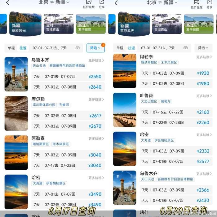 而6月30日,北京商报记者搜索发现,与前述航班同为7月1日去、7月7日返的北京—乌鲁木齐直飞航班最低价降至2430元;同为7月3日去、7月9日返的北京—阿勒泰直飞航班降价1110元至1930元;同为7月1日去、7月7日返的北京—哈密降价913元至2577元。