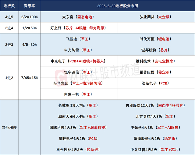 连板晋级率升至77.77%,此前3只3板以上个股全线实现晋级,且2只断板个股今日也均涨超6%。随着长城军工等多只热门板块高度龙头继续向上加速打开高度空间,20厘米个股的资金套利力度同步加强,晋级3连板的中光防雷在内的十余股涨停。不过在目前连板高度仍仅有5板之际,整个连板股接力情绪能否再上台阶仍尚有不确定性。作为此前资金深度抱团的算力硬件方向多股仍迭创历史新高,证明目前市场风格仍以趋势抱团为主导,因此近期军工、稳定币等热门方向中,其持续性仍取决于板块内的前排趋势核心龙头能否延续强势。