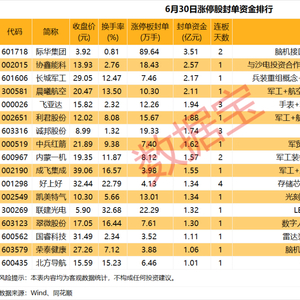 以封单金额计算,17股封单资金过亿元。其中,际华集团以3.51亿元的封单资金居首;紧随其后的是协鑫能科、长城军工和晨曦航空,封单资金依次为2.57亿元、2.17亿元、2.11亿元。