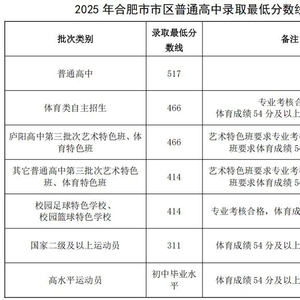 2025年合肥一中瑶海校区国防教育班将按照招生计划数,依据考生志愿按中考总分从高到低预录取50人。取得预录取资格的考生,须在规定时间、指定地点(另行通知)填写《身体健康承诺书》,并与合肥一中签订《入学协议书》,正式录取。如有缺额不再递补。录取到国防教育班的考生综合素质评价结果须达到省示范高中录取的要求,初中学业水平考试成绩须达到市区普通高中录取最低分数线。