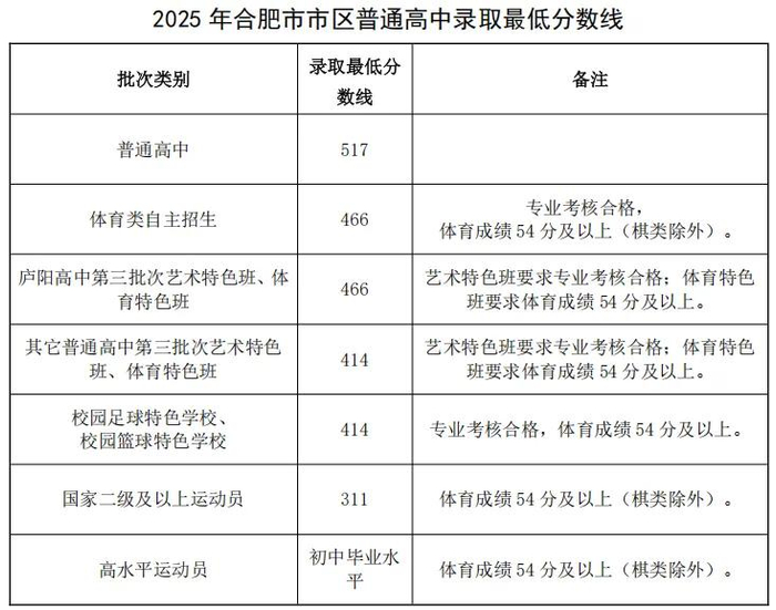 今年继续实行网上填报志愿,考生须到初中报名点学校按照志愿预填表信息进行网上填报。填报时间为7月5-9日。517分及以上符合条件的考生可以选报普通高中志愿。填报合肥庐阳高中第三批次艺术、体育特色班志愿的考生,中考总分须达到市区普通高中录取最低分数线(非艺体生,下同)的90%,即466分;填报一般普通高中艺术、体育特色班志愿的考生,中考总分须达到市区普通高中录取最低分数线的80%,即414分。填报艺术特色班志愿的考生须参加相应专业考核,并考核合格。填报体育特色班志愿的考生中考体育成绩不得低于该学科满分的90%,即54分(中考体育申请残疾免考考生不得填报体育特色班)。报考合肥三中、合肥十一中、庐阳高中、合肥三十二中等四所学校的国家二级及以上运动员考生,中考总分须达到市区普通高中录取最低分数线的60%,即311分。