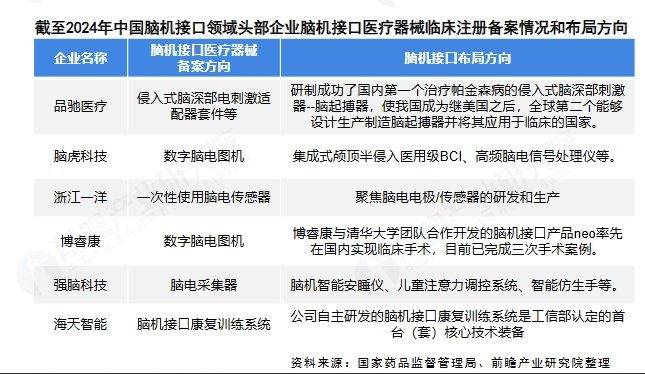 目前我国脑机接口产业已有百家企业有产品进入临床阶段,其中医疗器械临床备案注册数量最多的企业分别是品驰医疗、浙江一洋和博睿康等。