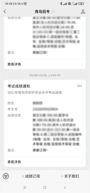 成绩发布时,“青岛招考”微信服务号将第一时间进行成绩推送,避免考生查询高峰期网络拥堵的不便。