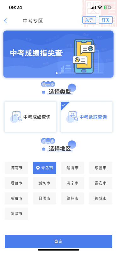 选择类型为“中考成绩查询”,选择地区为“青岛”,点击查询进入中考成绩查询界面。