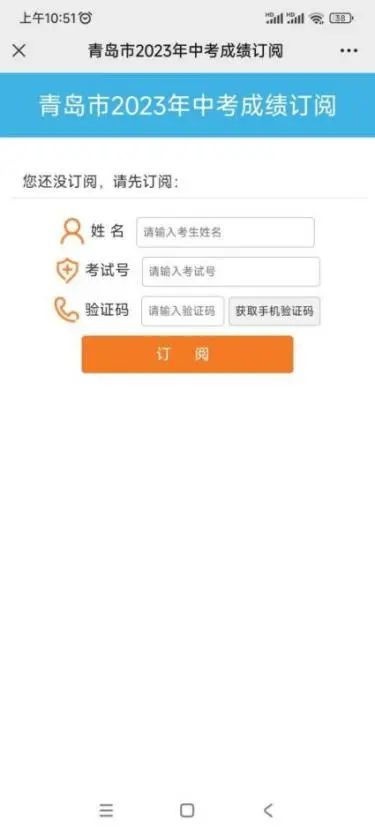 点击底部的“成绩订阅”,进入订阅页面,在页面中输入考生的姓名、考试号,然后点击“获取手机验证码”,系统会给相应的手机号(网上志愿填报时,在“联系手机”栏输入的号码)发送验证码,输入短信验证码后完成订阅。
