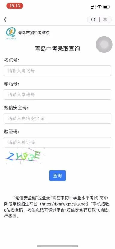 (三)“短信安全码”的使用(以中考平台录取查询为例)
