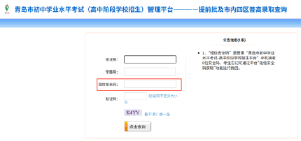 在录取查询界面中输入考生的考试号、学籍号、“短信安全码”和验证码,点击查询按钮即可查询中考录取去向。