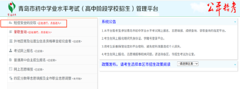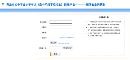登录青岛教育政务网(网址:http://edu.qingdao.gov.cn),通过“招生考试”栏目中的“便民服务系统”进入中考平台,点击“短信安全码获取”,进入短信安全码获取页面。