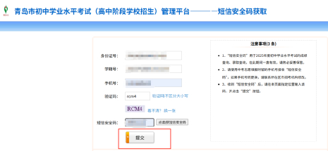 在短信安全码获取页面对应文本框中正确输入身份证号、学籍号、手机号(中考志愿填报时留的手机号)及验证码等信息后,点击“获取短信安全码”按钮,平台就会通过短信方式将“短信安全码”发送到该手机号。