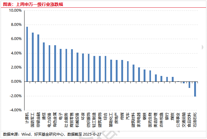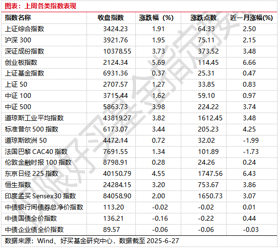 上周港股表现较好,恒指/恒生科技指数分别上涨3.2%/4.06%;欧美主要市场普遍上涨,其中标普500上涨3.44%,纳指100上涨4.2%,MSCI欧洲上涨3.04%;亚太市场普涨,印度sensex30上涨2%,日经225指数上涨4.55%。