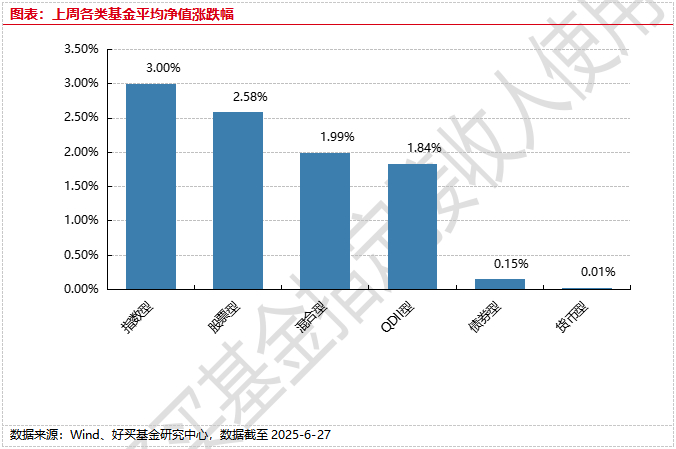 上周,国内权益基金普遍上涨,其中指数型基金平均上涨3%,股票型和混合型基金平均分别上涨2.58%和1.99%。
