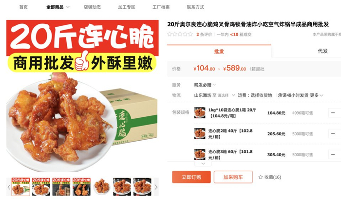 此外,鸡叉骨的出成率也较高。经过腌制、裹粉、油炸等工序后,鸡叉骨的重量会有所增加,这也为商家提供了更多的利润空间。“一般腌制好的鸡叉骨,上面都是带着面糊和酱料的,买一斤送半斤,里面也是包含面糊的重量的,所以卖出去的每一份鸡叉骨成本并不高。