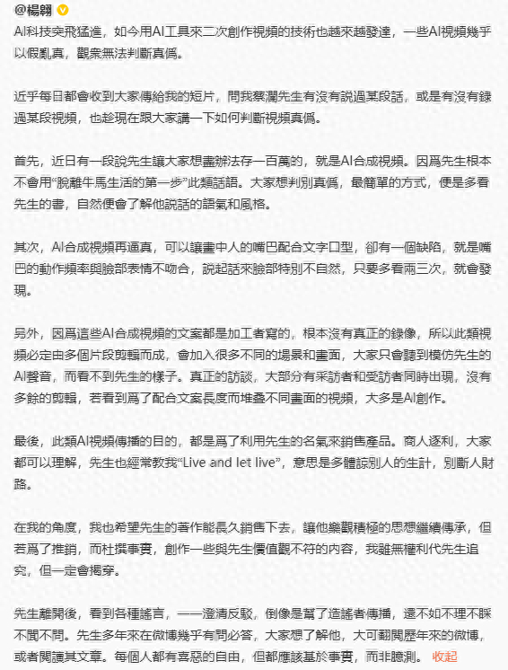 “此类 AI 视频传播的目的,都是为了利用先生的名气来销售产品。商人逐利,大家都可以理解,先生也经常教我多体谅别人的生计,别断人财路。”杨翱表示,“在我的角度,我也希望先生的著作能长久销售下去,让他乐观积极的思想继续传承,但若为了推销,而杜撰事实,创作一些与先生价值观不符的内容,我虽无权利代先生追究,但一定会揭穿。先生离开后,看到各种谣言,一一澄清反驳,倒像是帮了造谣者传播,还不如不理不睬不闻不问。先生多年来在微博几乎有问必答,大家想了解他,大可翻阅历年来的微博,或者阅读其文章。每个人都有喜恶的自由,但都应该基于事实,而非臆测。”