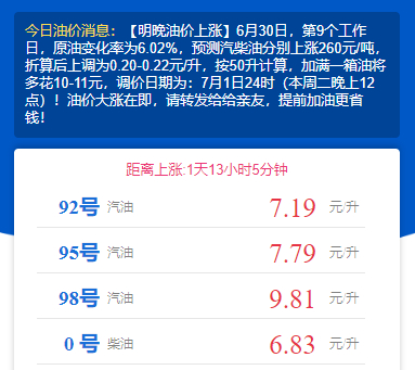 据今日油价查询动态消息,国家发改委新一轮成品油调价窗口将于7月1日(周二)24:00 准时开启。本轮计价周期共9个工作日,原油综合变化率持续攀升,预计——