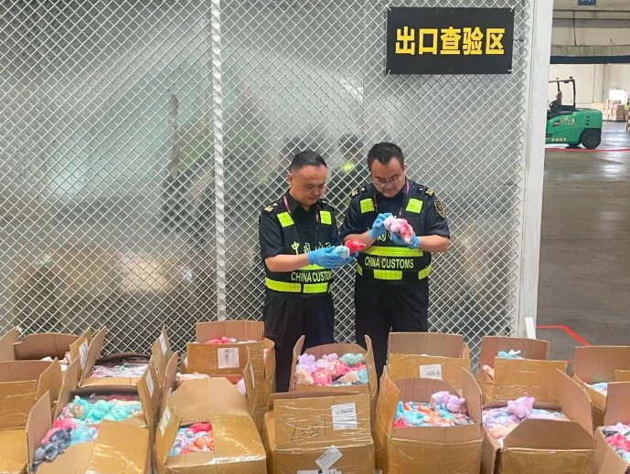 郑州海关所属郑州机场海关在对一批跨境电商出口货物开展监管时,发现申报为“聚酰胺衣/女士”的货物中,装有大量印有“POP MART”(泡泡玛特)“LABUBU”品牌标识的玩偶,做工粗糙且部分为简陋纸袋包装。现场关员初步判断这些玩具涉嫌侵权,经联系权利人,确认均为侵犯相关商标权的货物。经清点,共有玩偶挂件2408件。