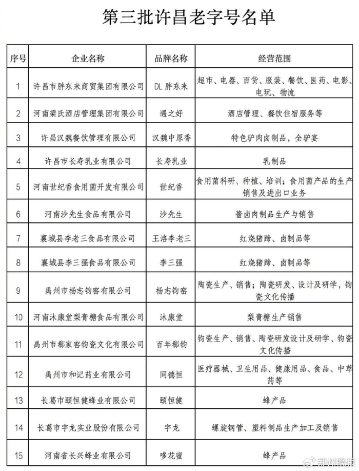 许昌市商务局:经企业申报、各县(市、区)商务主管部门初审推荐、企业补充完善资料、专家评审、社会公示等程序,认定许昌市胖东来商贸集团有限公司“DL胖东来”等15个品牌为第三批许昌老字号。