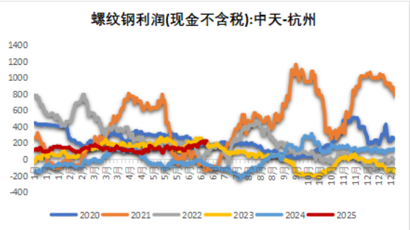 25年1-5月生铁测算产量3.75亿吨,累计同比增3.12%。1-2月份,在悲观情绪及弱现实需求下钢厂检修水平较高,生铁产量增长较慢;3月份开始,在出口需求前置和钢厂盈利水平提升的情况下,生铁产量随着季节性迅速增长;6月份开始铁水见顶缓慢下滑,但钢厂的盈利水平下滑有限,显示出需求仍有一定韧性,后续生铁产量或仍维持稳定。