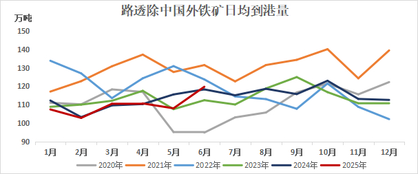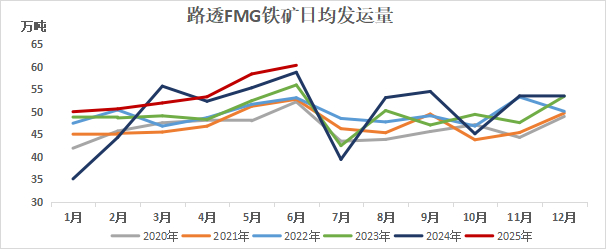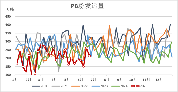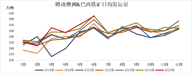 从路透发运数据来看,2025年1-6月发运同比略有降低。截止2025年6月19日(本文数据均截止至此日期),全球日均发运量为425万吨/日,同比429万吨/日降低1%。澳巴两地区发运在一季度受到天气影响出现明显减量,3月份开始发运量明显回升,非主流地区发运量近年来持续偏低。