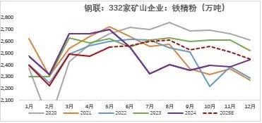 2025年前5个月国内铁矿石累计产量同比下滑5.4%,下半年或有所增加,25年国产精粉预计同比增162万吨(+0.54%)至2.99亿吨。