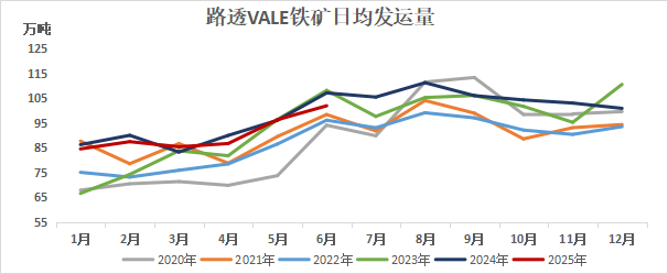 1-6月巴西发运量维持高位,日均99.4万吨/日,同比98万吨/日增1.4%;VALE发运量也处近五年高位,日均90.4万吨/日,同比92万吨/日减1.7%。