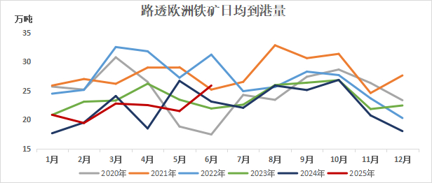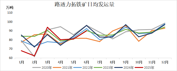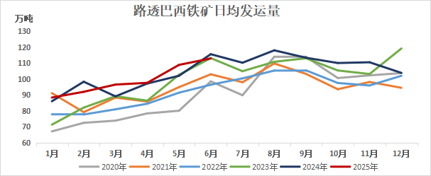 2025年1-6月,澳洲和巴西两国日均发运量为347.5万吨/日,同比346.7万吨/日增0.23%;非主流地区日均发运量为77.2万吨/日,同比82.5万吨/日减6.4%。