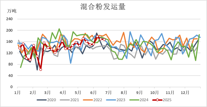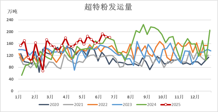 1-6月FMG日均发运量54万吨/日,同比50.24万吨/日增7.5%。24年下半年开始超特粉发运表现强劲,混合粉发运量持续偏弱。