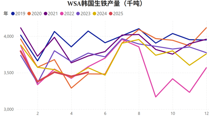 24年韩国铁水累计4411万吨,同比降109.8万吨或2.42%,25年生铁产量预计同比持平。