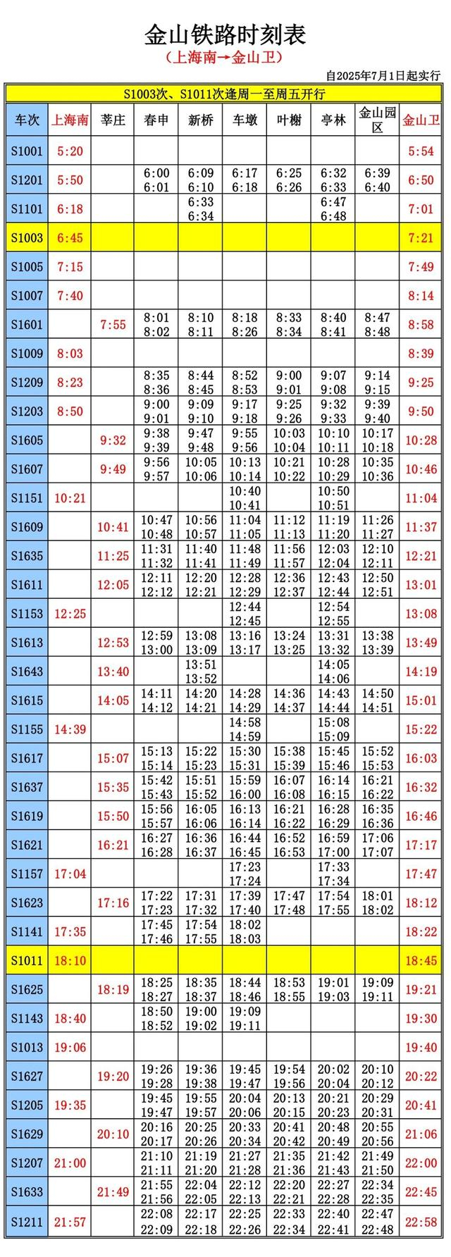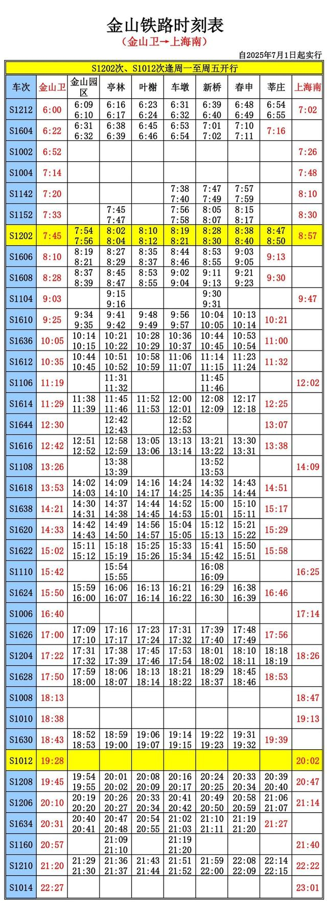 其中,早高峰时段S1209次始发地车站由莘庄站改为上海南站,晚高峰上海南站至金山卫站S1157列车的始发时间由原16时51分调整为17时04分。此外金山铁路还增开一趟晚间21时57分上海南站至金山卫站的S1211次列车。