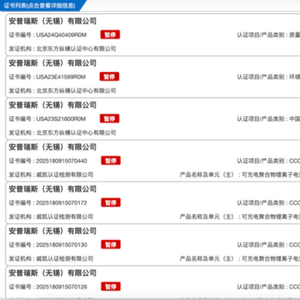 根据电池交易网的信息,截至2024 年10 月,采用安普瑞斯电池的企业除了安克、罗马仕,还有小米、绿联、倍思、麦多多等知名品牌,以上企业的3C认证均被暂停或撤销。