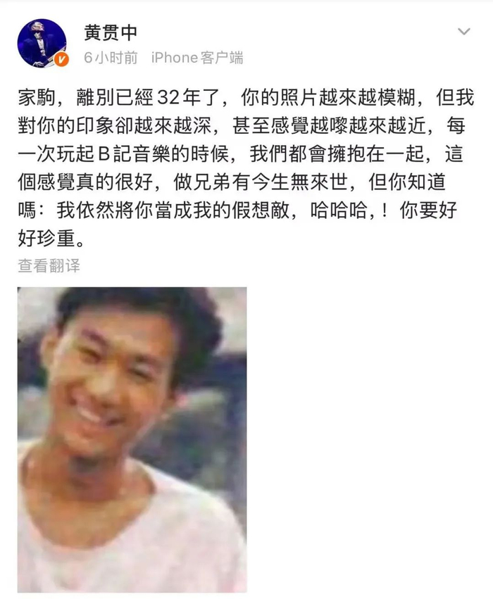 “家驹,离别已经32年了,你的照片越来越模糊,但我对你的印象却越来越深,甚至感觉越来越近。每一次玩起B记音乐的时候,我们都会拥抱在一起,这个感觉真的很好。做兄弟有今生无来世,但你知道吗:我依然将你当成我的假想敌,哈哈哈!你要好好珍重。”