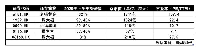 与黄金股2025年上半年的走势相比,老铺黄金的走势可谓“一骑绝尘”。新华财经数据显示,今年上半年,周大福涨幅为99.4%,市盈率为22.4倍;六福集团和周生生上半年涨势均逼近40%。