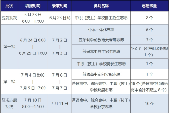 根据安排,第一批次的普通高中自主招生志愿,含强基计划、特长生、特色班、中外合作办学项目,录取时间为7月2日至3日。第二批次填报前,“宁波教育考试”微信公众号将公布普高剩余计划数,填报页面将提供未录取考生位次号(剔除已被录取的所有考生)。