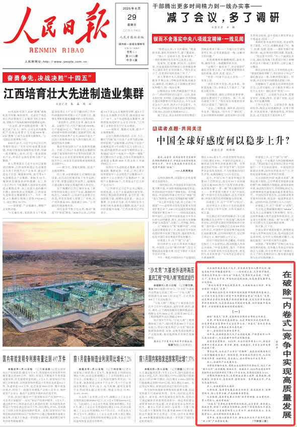 6月29日,人民日报在头版发表金社平文章《在破除“内卷式”竞争中实现高质量发展》。