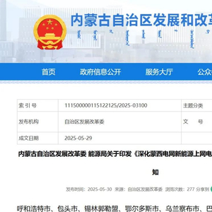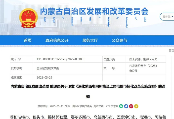 为贯彻落实国家发展改革委、国家能源局《关于深化新能源上网电价市场化改革 促进新能源高质量发展的通知》(发改价格〔2025〕136号)文件精神,我们组织制定了《深化蒙西电网新能源上网电价市场化改革实施方案》,现印发给你们。请电网企业及电力交易机构认真做好组织落实,各盟市发展改革委、能源局要积极配合做好政策宣传和解读,密切跟踪改革落实情况,重要情况及时报告自治区发展改革委、能源局。