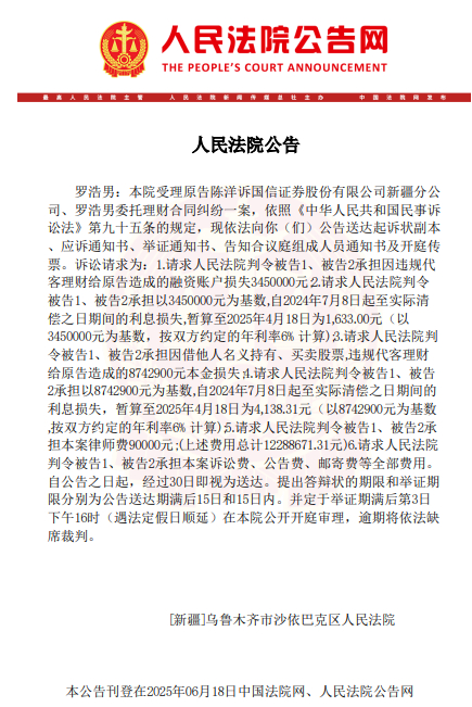 6月18日,新疆乌鲁木齐市沙依巴克区人民法院(简称:沙依巴克区法院)就原告陈某诉国信证券新疆分公司、罗浩男委托理财合同纠纷一案,向罗浩男公告送达起诉状副本、应诉通知书、举证通知书、告知合议庭组成人员通知书及开庭传票。