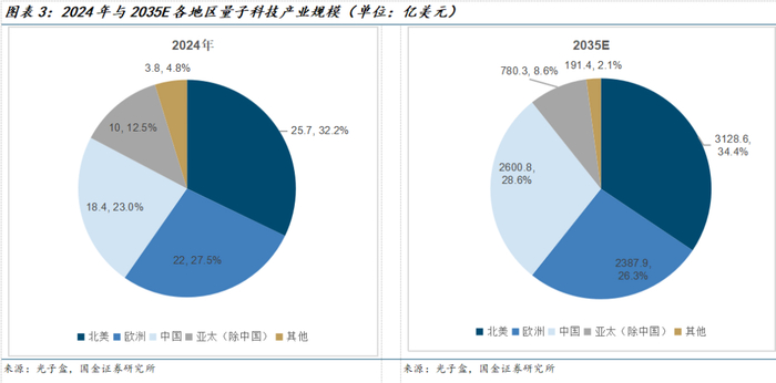 北美在量子领域的的影响力较大,中国市场增长潜力尤为显著。分地域来看,全球量子科技产业呈现出动态变化的趋势。2024年,北美、欧洲和中国量子产业规模分别达25.7亿美元、22.0亿美元和18.4亿美元。预计2035年,北美仍将以34.4%的市场份额保持全球领先地位,中国量子产业有望在政策与技术的双重驱动下,市场份额反超欧洲增至2600.8亿美元。