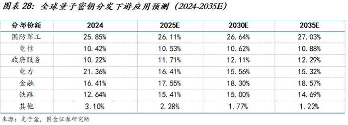 下游应用覆盖多行业场景,军工行业应用面最广。2024年,量子安全主要用于国防军工领域中军事机密通信,防范窃听与网络攻击,市场应用份额占比达25.85%。其次分别为电力与金融领域,市场份额分别占比21.36%和16.41%。尽管当前量子安全产业仍处于发展初期,但产业链各环节协同推进,技术发展路径已从验证测试阶段快速向规模化商业应用转型,预计未来军工和金融等重点行业的市场渗透率将进一步提升,应用范围也将持续扩大。