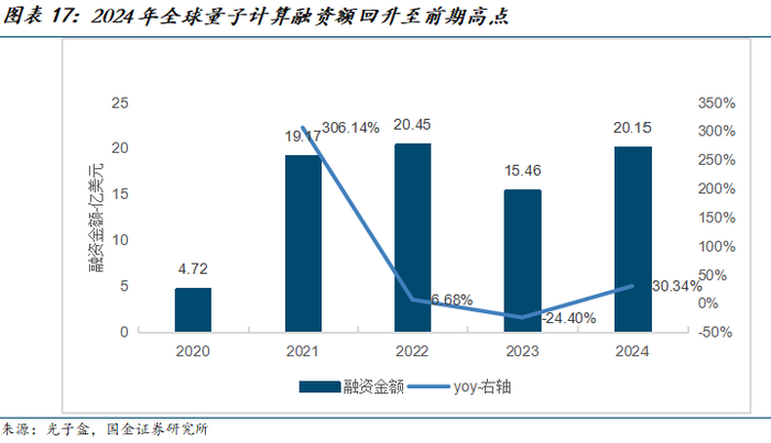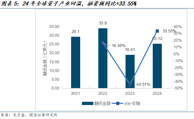 量子产业仍是“蓝海”,全球投融资呈现波动上升趋势。近年来,量子领域的投资额在过去的四年中呈现震荡趋势。在全球经济下行背景下,2023年整体融资规模有所下降,投资者开始倾向于等待实用且可扩展的量子优势明确后,再开展针对性投资布局。2024年,量子领域融资金额有所回升,总融资金额增长33.55%,产业热度开始回温,量子行业成长动能有所增强。预计在各国政策持续加码和关键技术不断突破的双重驱动下,2025年全球量子科技领域的融资规模有望继续实现显著增长。