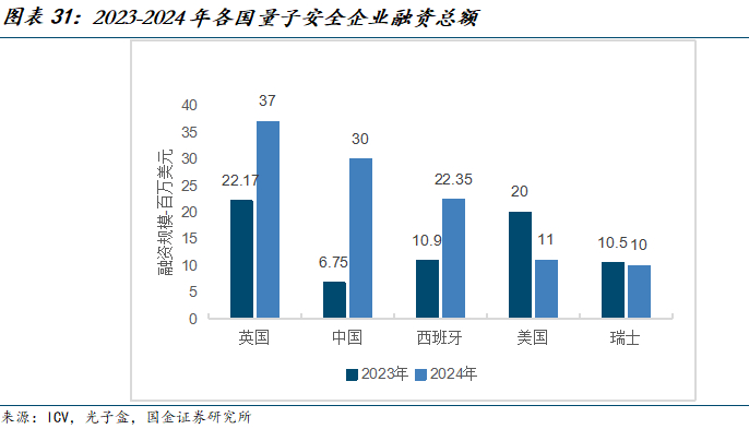 美国融资规模有所下降,中国投入力度明显上升。分地区来看,2024年,量子安全领域的投资涉及来自9个国家的企业,其中英国、中国和西班牙获得的投资金额位居前列。尽管近两年量子安全领域的融资出现下滑,但中国正积极布局量子安全领域产业,并出台了系列政策措施,推动量子通信的研发和应用,24年全年融资额较23年增长近5倍。