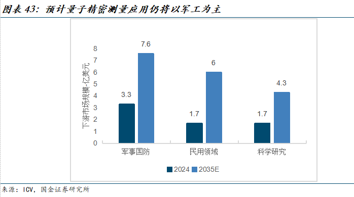 下游应用覆盖多个领域,军工市场优势显著。量子精密测量产业链下游为应用与服务,主要覆盖国防、医疗、科研、航空航天等应用领域。2024年,军工在量子精密测量下游应用中的规模为3.3亿美元,占比近半,成为推动量子精密测量技术发展的首要应用方向。
