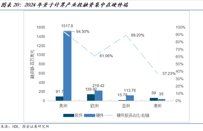 基于当前量子技术发展阶段与产业规律,预计量子计算产业的演进路径将遵循“硬件先行”的发展范式。目前,量子计算全球投融资格局呈现硬件优先特征。从技术层面来看,现有含噪声中等规模量子(NISQ)处理器受限于量子比特数量、相干时间及保真度等关键参数,尚难以有效支撑量子算法的理论性能实现,这使得硬件性能提升成为突破当前计算瓶颈的核心挑战。从产业发展规律看,参照经典计算机的发展轨迹,在其商业化初期的30年间,行业利润主要集中于硬件领域,直至硬件技术趋于成熟后,软件应用才逐步成为价值创造的主体。因此,在可预见的产业化进程中,上游硬件研发或将持续占据投资主导地位。