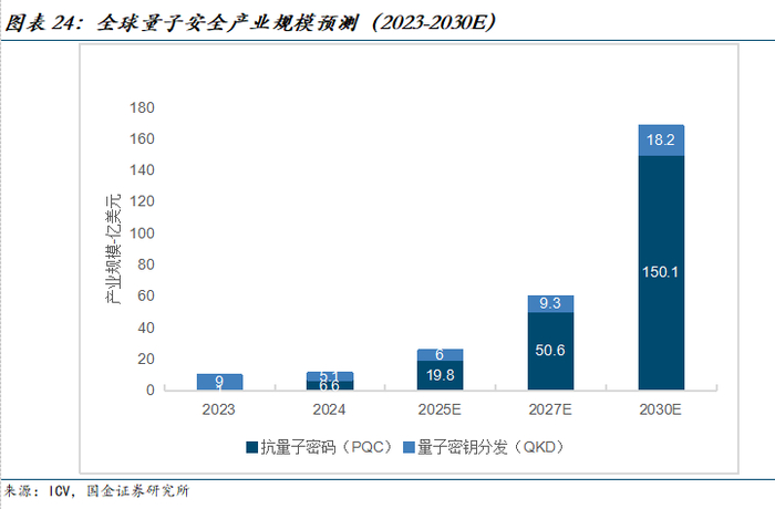信息传输或面临“量子威胁”,抗量子密码是未来网络安全核心技术。随着量子计算发展,信息传输破译风险明显增加,催生抗量子密码技术快速发展。2024年,量子安全市场规模达11.7亿美元,同比+17%,其中抗量子密码市场规模增长超6倍。随着抗量子密码逐步商用和后量子密码标准化,预计2025-2030年抗量子密码市场规模将以49.9%的复合增速增长,并在2030年突破150亿美元。