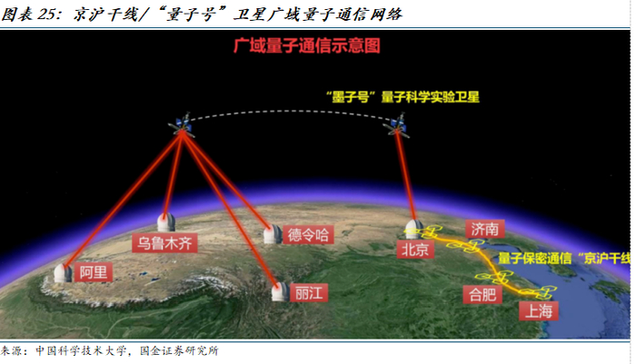 中国量子通信技术已初步具备商用条件,量子安全组网或加速建设。在政策引导与重点行业需求的双重驱动下,中国已构建起全球领先的量子通信网络体系。近年来,中国加速推进量子通信领域产业化,以“京沪干线”和“武合干线”为代表的地面量子通信骨干网络,与“墨子号”量子科学实验卫星相结合,构建了天地一体化的量子通信网络。截至2023年底,中国已部署的量子保密通信光缆总长度突破1万公里,覆盖粤港澳、京津冀、长三角、成渝等重点区域。随着量子中继关键技术突破、量子微纳卫星与小型化地面站实用化,中国量子通信网络建设有望进一步提速。