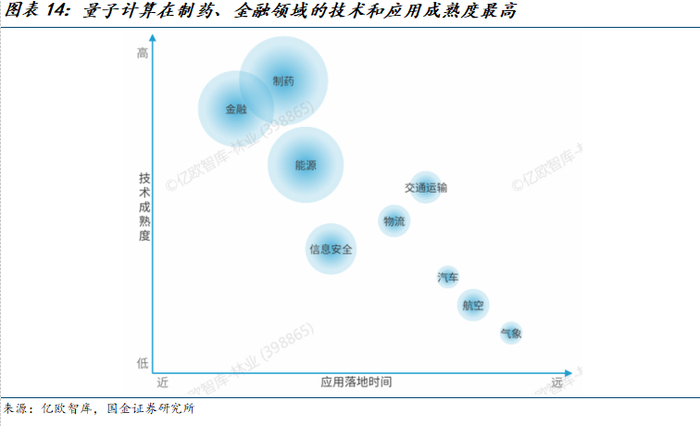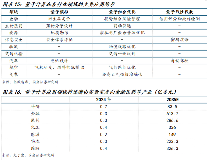 量子计算进入行业应用探索阶段,金融、生物医药和能源或为最具潜力应用方向。量子计算下游应用空间广泛,应用路径主要包括量子模拟、组合优化和线性代数求解,可以在衍生品定价、风险管理、药物筛选、药物分子设计等实际问题上展现出远超经典计算机的性能。根据光子盒数据,随着技术成熟度提升,到2035年金融领域将成为量子计算最主要的应用场景,并占据30.41%的市场份额,医药(14.20%)和能源(7.38%)领域也有望实现规模化应用。