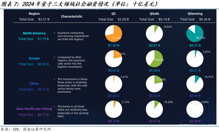北美社会融资集中于量子计算和量子精密测量两大领域,欧洲与中国则以量子安全为核心投资重点。2024年,北美地区的社会资本主要流向量子计算与量子精密测量领域,分别占全球社会融资的71.18%和85.72%。而欧洲则在量子安全方面表现突出,以59.92%的社会融资占比位居该领域全球首位。中国的社会资本投资倾向与欧洲相似,主要资金集中投入到量子安全领域,但在量子计算和量子精密测量领域,中国社会融资仍显不足。