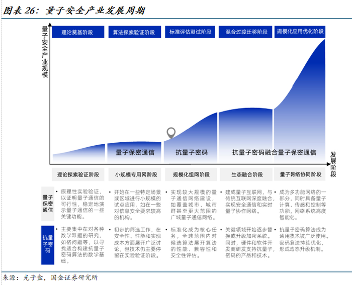 QKD与PQC技术有望融合发展,量子安全将从专用网络向泛安全基础设施演进。量子安全产业发展周期呈现震荡上升趋势。产业发展初期,主要聚焦于量子保密通信领域,目前已从实验室验证进入规模化组网阶段,当前重点在于提升城域量子密钥分发(QKD)网络的密钥分发速率和传输距离。同时,抗量子密码(PQC)近年来受到的关注度与日俱增,正经历从NIST标准化评估到产业迁移的关键过渡期。未来,随着标准化制定持续推进,叠加信息传输安全需求不断攀升,PQC有望迎来大规模应用,其与QKD的融合趋势也会愈发明显,最终实现量子时代端到端的信息安全传输。