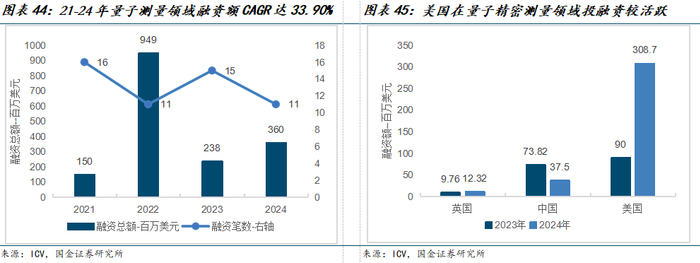 资金投向较为集中,美国投融资领先优势明显。全球量子精密测量领域的投融资活动展现出多元化特征,并且投资呈现出集中化趋势。2021年至2024年,全球量子精密测量领域的融资额年复合增长率(CAGR)约33.90%。2024年,全球共有11家量子精密测量相关企业参与了投融资活动,融资总额达3.6亿美元,与量子计算和量子安全领域相比,量子精密测量投融资主要集中在中美等少数国家。其中,美国融资额达3.09亿美元,占比达85.7%,具备明显优势。