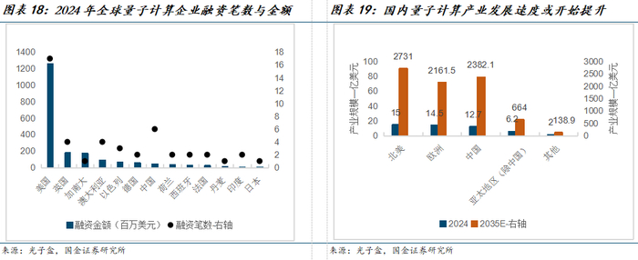 美国具有先发优势,中国增长潜力最大。分地区来看,美国以12.60亿美元的总融资规模位居全球首位,在量子计算领域同时展现出资金规模和资本活跃度的双重优势。相比之下,中国虽然交易数量排名靠前,但单笔融资规模较小,2024年企业融资总额仅为0.47亿美元,位列全球第七,仅为美国的3.7%,与英国、澳大利亚等国也存在显著差距。但在政策支持和技术升级的双重推动下,预计到2035年,中国量子计算产业规模将从12.7亿美元增长至2382.1亿美元,实现量级跃迁并反超欧洲。