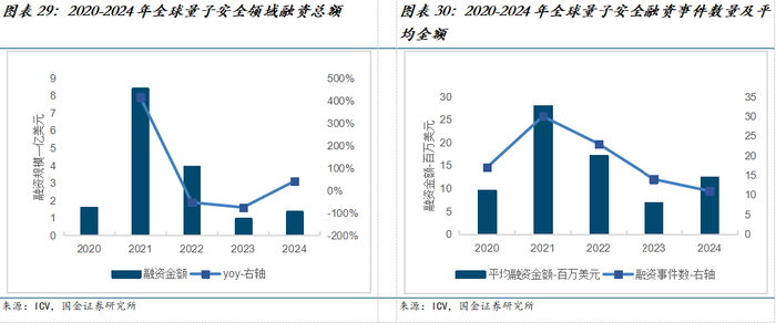 行业马太效应明显,资本向具备明确技术路线和商业场景的企业集聚。2024年,量子安全领域共有11家公司获得1.37亿美元融资,较23年融资事件数有所降低,但平均融资额同比增长近80%,单个项目的吸引力逐步增强,投资者对优质项目的投入力度有所增加,行业头部效应更加明显。